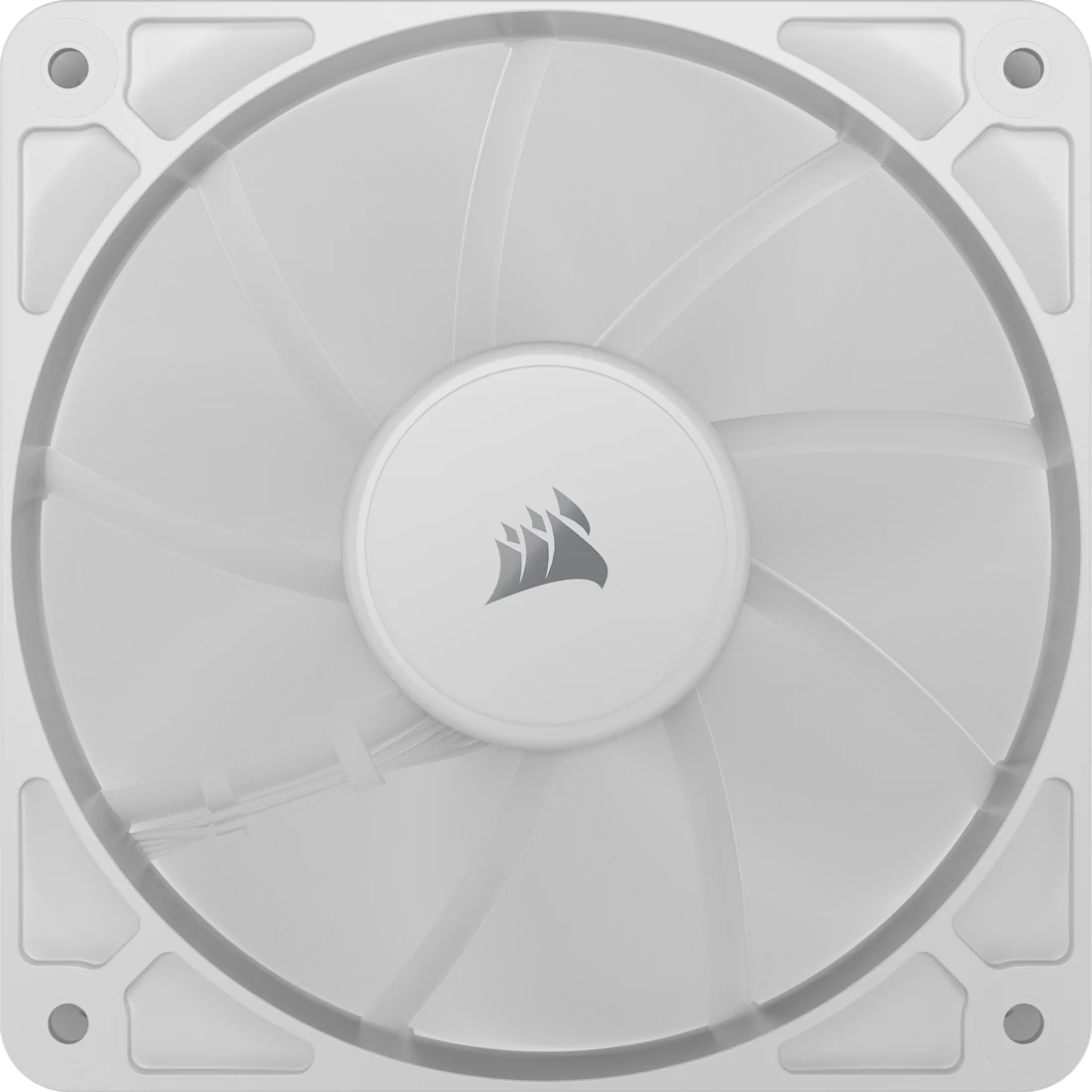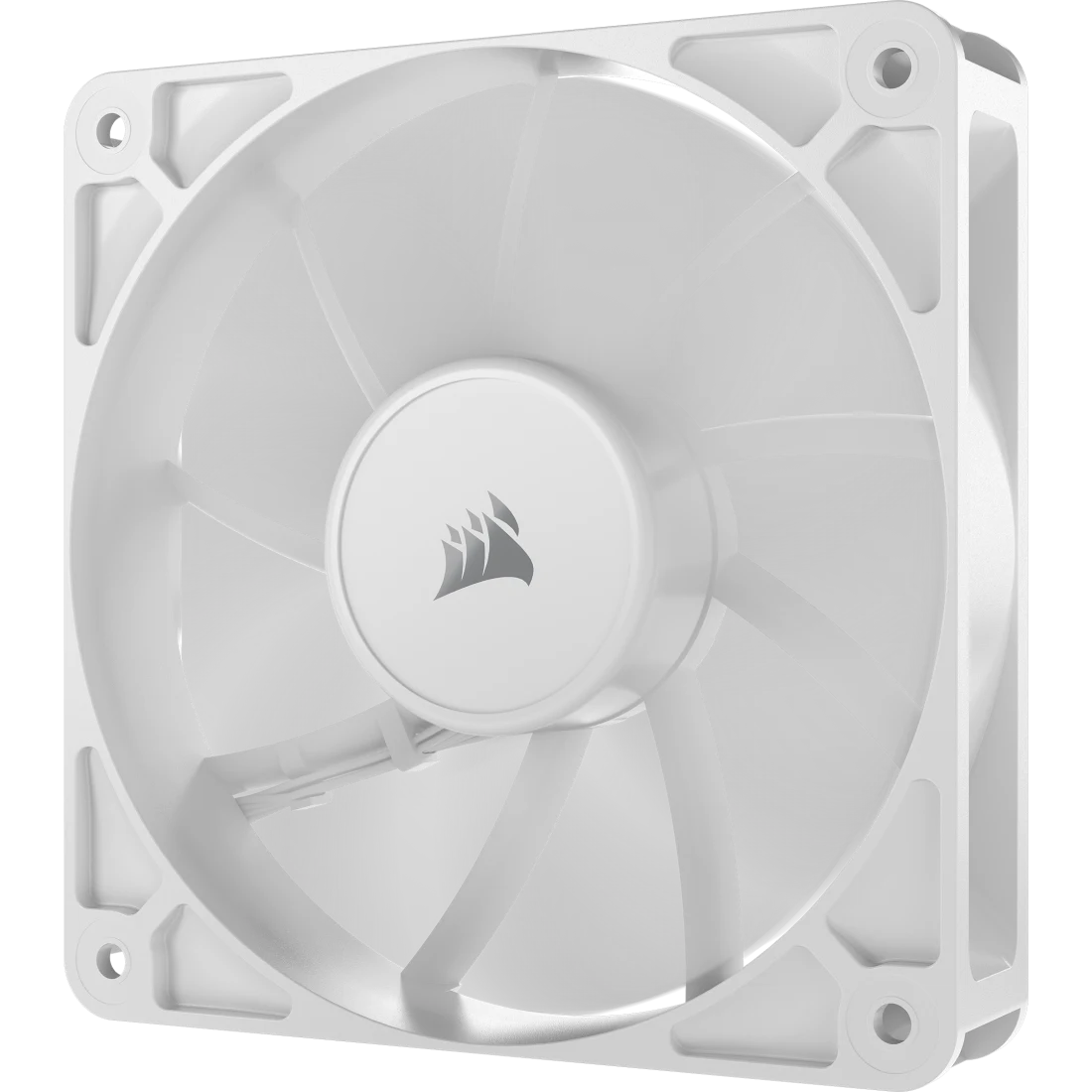 Kit de tres ventiladores Corsair RS120 blancos de 120mm con control PWM, diseñados para alto flujo de aire y operación silenciosa, sin iluminación RGB.