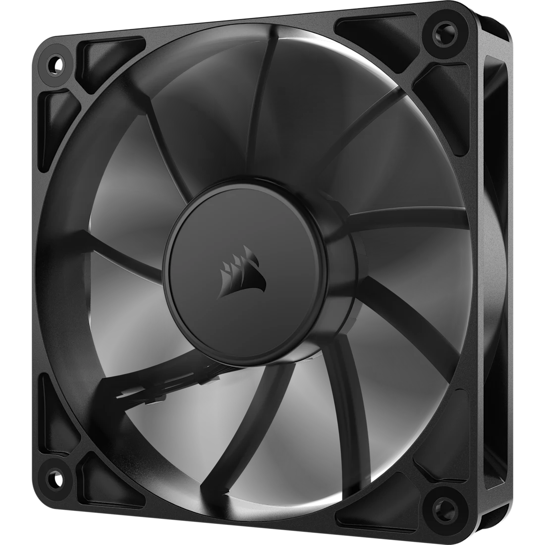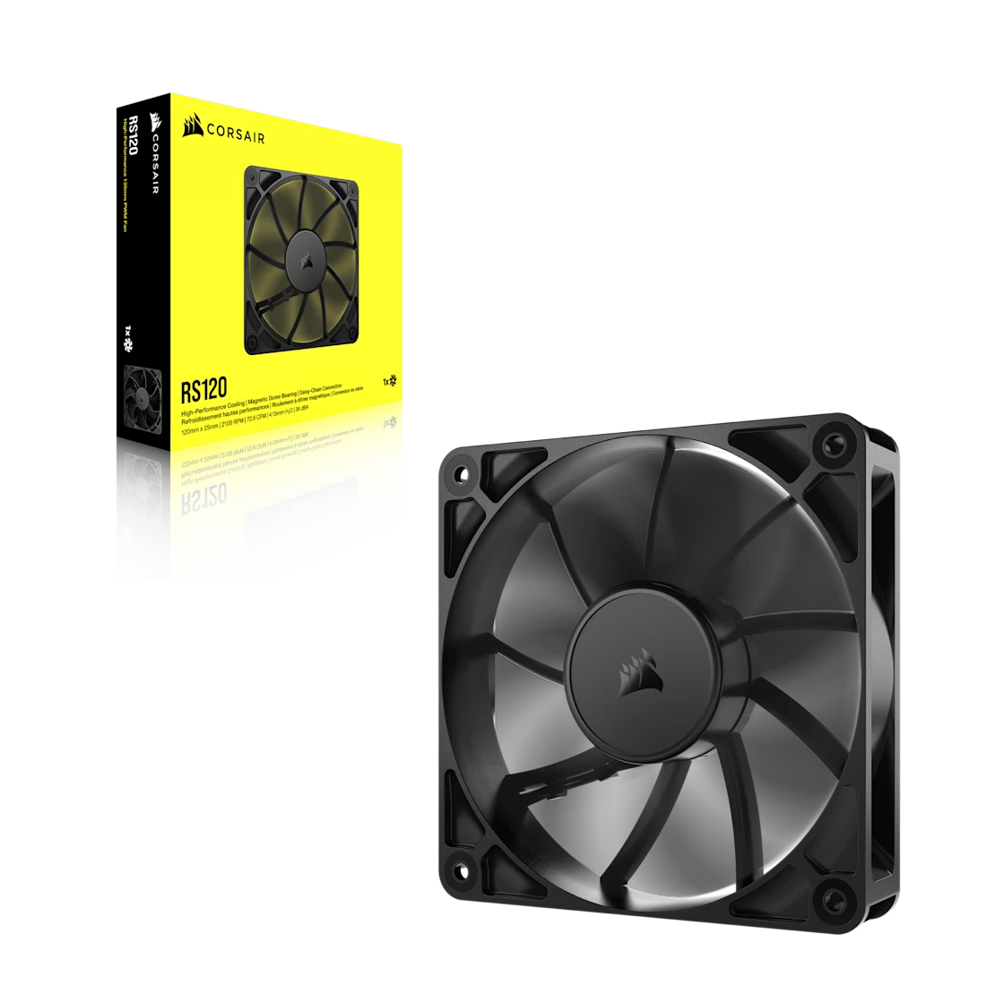 Ventilador Corsair RS120 de 120mm con control PWM, diseñado para alto flujo de aire y operación silenciosa, sin iluminación RGB.