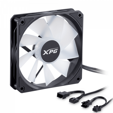 Ventilador XPG VENTO R 120 ARGB negro con diseño de aspas inversas, control PWM y 9 LEDs ARGB, ideal para admisión de aire con iluminación visible.