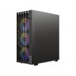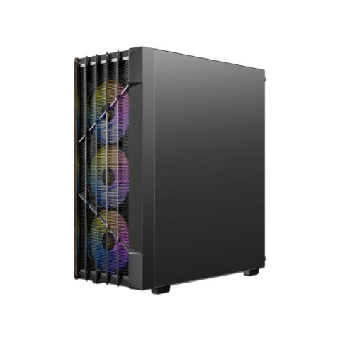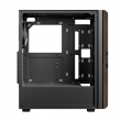 Gabinete Media Torre ATX negro con detalles en madera, vidrio templado, 4 ventiladores ARGB, USB-C frontal y soporte para GPU de 360 mm. Ideal para builds estéticos y potentes.