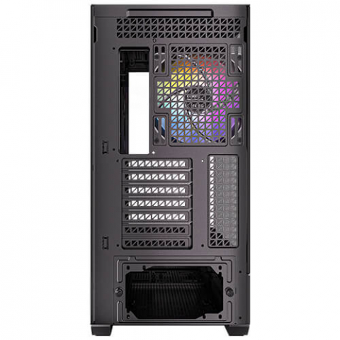 Gabinete Media Torre ATX negro con vidrio templado, 4 ventiladores ARGB, USB-C frontal y soporte para GPU de 360 mm. Ideal para builds potentes con estética moderna.