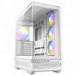 Gabinete mid-tower blanco con diseño panorámico, ventiladores ARGB incluidos y soporte para placas E-ATX, ideal para builds visuales y de alto rendimiento.