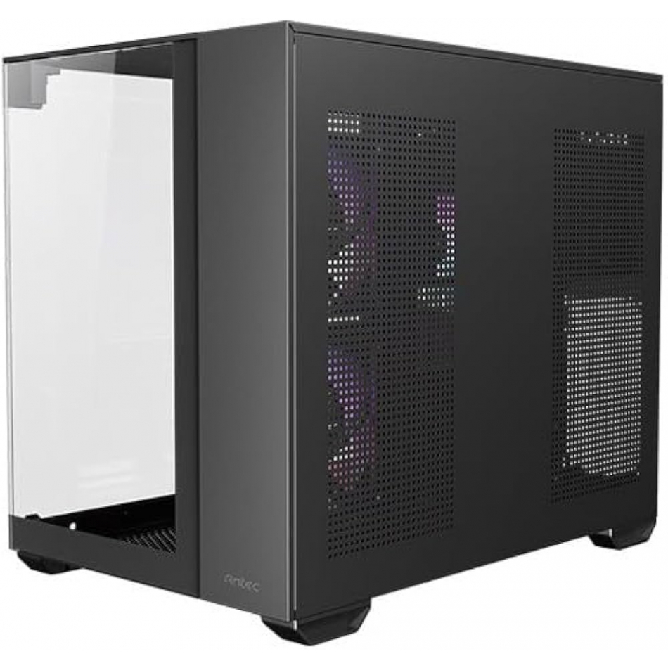 El Antec CX600M ARGB_B es un gabinete Mini-Tower con diseño moderno y estructura de doble cámara, ideal para builds compactos con estética ARGB. Su chasis de acero incluye paneles de vidrio templado en el frente, lateral y parte superior , ofreciendo una vista panorámica del interior.