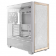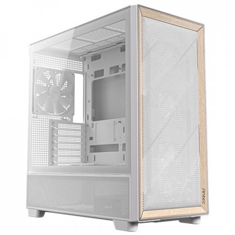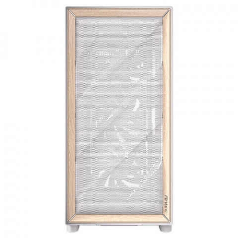 Gabinete Antec FLUX White con panel de vidrio y madera, 5 ventiladores PWM, USB-C, y soporte para radiadores de hasta 420 mm. Flujo de aire extremo con estética refinada.
