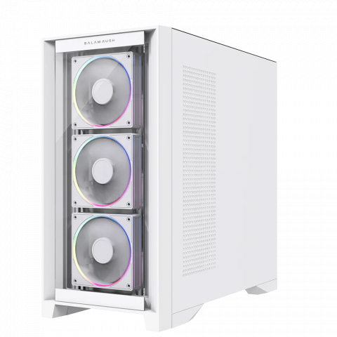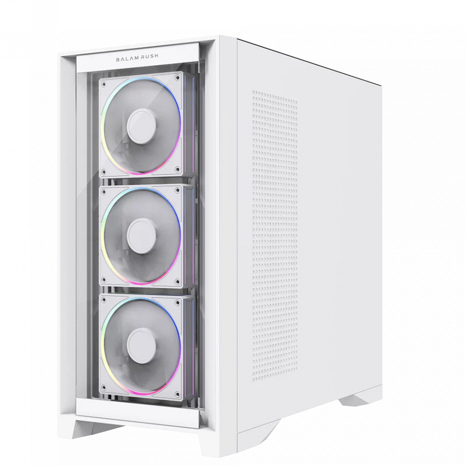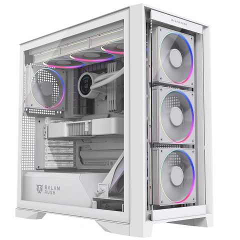 Gabinete Balam Rush Carbono Polar Twin Mate 9900 blanco, media torre con panel de cristal templado, ventiladores ARGB incluidos y soporte para enfriamiento líquido hasta 360 mm. Ideal para builds gamer de alto rendimiento.