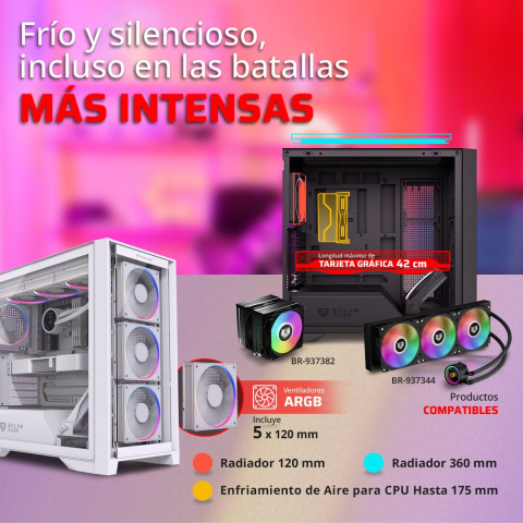El Balam Rush Carbono Polar Twin Mate 9900 (BR-941464) es un gabinete gamer de media torre diseñado para configuraciones ATX, Micro-ATX e ITX. Su estructura combina panel lateral de cristal templado y un diseño moderno en color blanco, con soporte para iluminación ARGB y ventilación optimizada. Incluye ventiladores preinstalados y capacidad de expansión para sistemas de enfriamiento líquido o por aire, lo que lo convierte en una opción versátil para builds de alto rendimiento. Además, cuenta con un sistema de gestión de cables para mantener el ensamble limpio y ordenado.