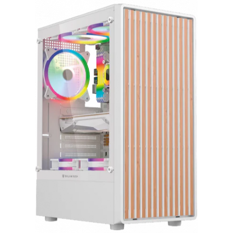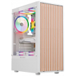 Gabinete Balam Rush Dragonfly Wood GM580 , ATX, frente tipo madera, panel lateral de cristal templado, incluye 4 ventiladores ARGB, sin fuente de poder, color blanco.