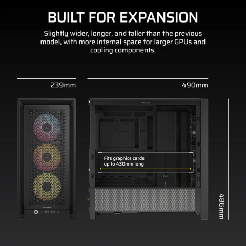GABINETE CORSAIR FRAME 4000D RS ARGB MODULAR MID-TOWER NEGRO CC-9011296-WW CON SISTEMA INFINIRAIL™, ILUMINACIÓN ARGB, SOPORTE PARA PLACAS BACK-CONNECT, 3 VENTILADORES RS120 ARGB INCLUIDOS, COMPATIBILIDAD ATX/EATX/MATX/MINI-ITX Y SOPORTE PARA RADIADORES DE 360 MM
