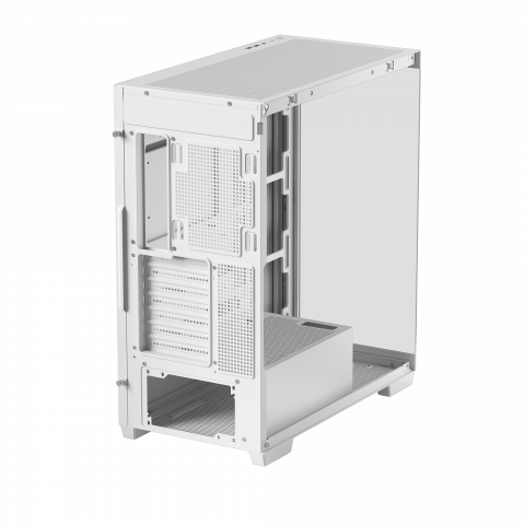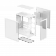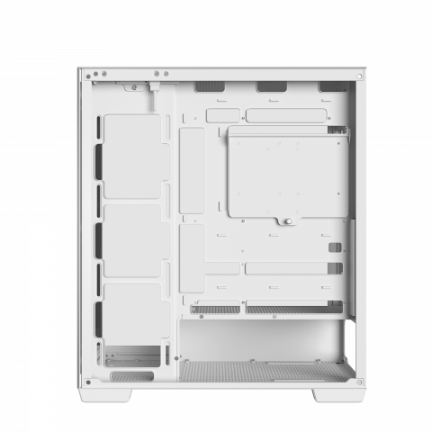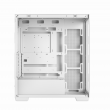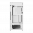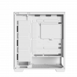 Gabinete blanco con diseño panorámico sin pilares, paneles de vidrio templado y cuatro ventiladores ARGB PWM preinstalados. Compatible con placas ATX, Micro-ATX e ITX, ideal para builds modernos con estética limpia y alto rendimiento térmico.