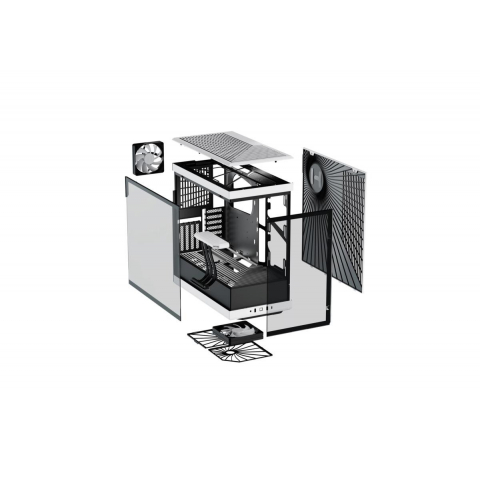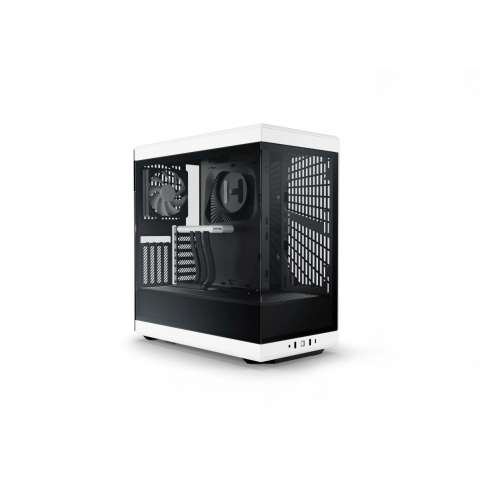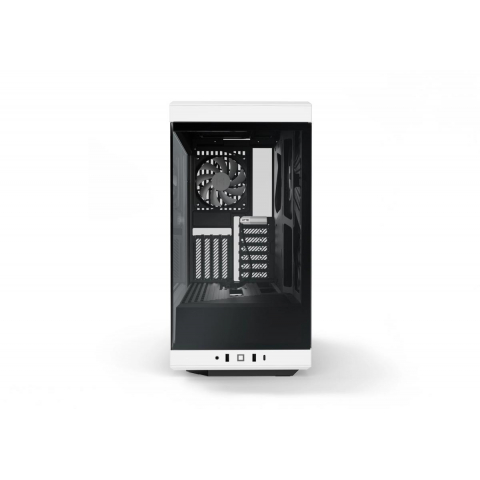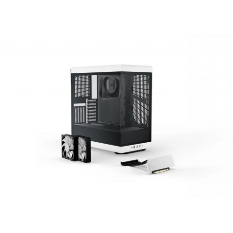 Gabinete HYTE Y40 Snow White tipo Media Torre con vidrio templado panorámico, 2 ventiladores incluidos, riser PCIe 4.0 para GPU vertical, y soporte para placas ATX/Micro-ATX/Mini-ITX. Ideal para builds estéticas y funcionales en blanco total.