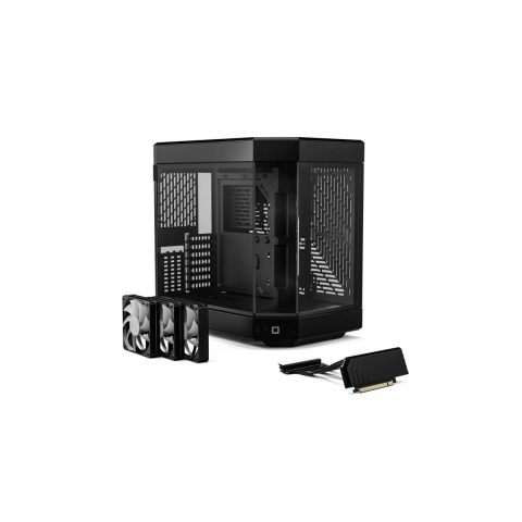 Gabinete HYTE Y60 negro tipo Media Torre con vidrio templado panorámico, diseño dual chamber, riser PCIe 4.0 incluido y soporte para GPU vertical. Ideal para builds premium con estética envolvente.
