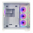 Gabinete Mid-Tower blanco con panel de vidrio, 4 ventiladores ARGB y conectividad moderna, ideal para builds compactas y visualmente atractivas.