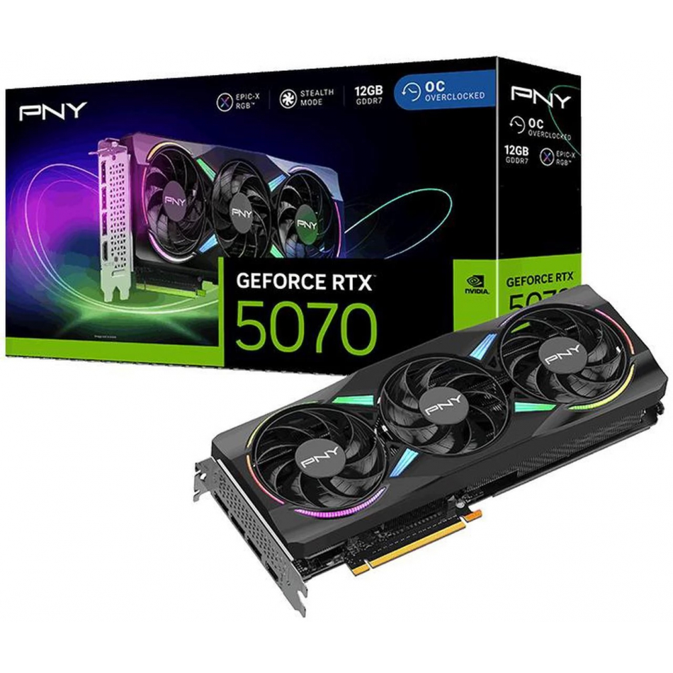 Tarjeta gráfica PNY RTX 5070 Triple Fan ARGB OC con 12GB GDDR7, PCIe 5.0 x16, trazado de rayos, DLSS 4, triple ventilador con iluminación ARGB y rendimiento extremo para gaming en 1440p/4K.