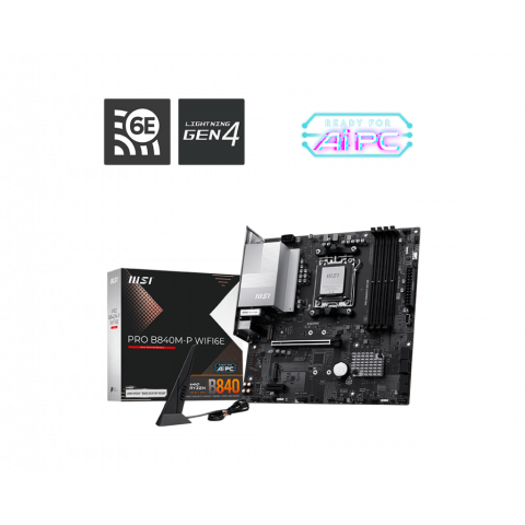La MSI PRO B840M-P WiFi6E es una placa base mATX para procesadores AMD Ryzen™ 9000/8000/7000, con soporte DDR5, PCIe 4.0, Wi-Fi 6E, LAN 2.5G y funciones EZ DIY, ofreciendo rendimiento estable y conectividad avanzada para entornos profesionales y de productividad.