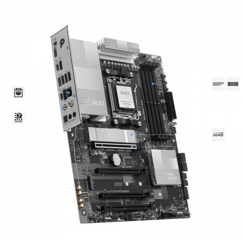 Tarjeta madre ATX con socket AM5, soporte DDR5 hasta 8200 MHz, triple M.2, PCIe Gen5, HDMI, DisplayPort, Wi-Fi 7 y LAN 5G. Ideal para builds modernos con alto rendimiento y conectividad avanzada.
