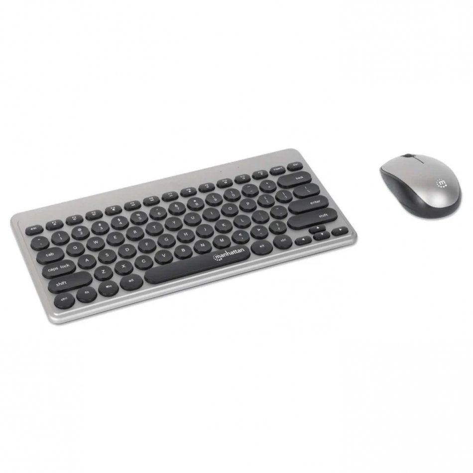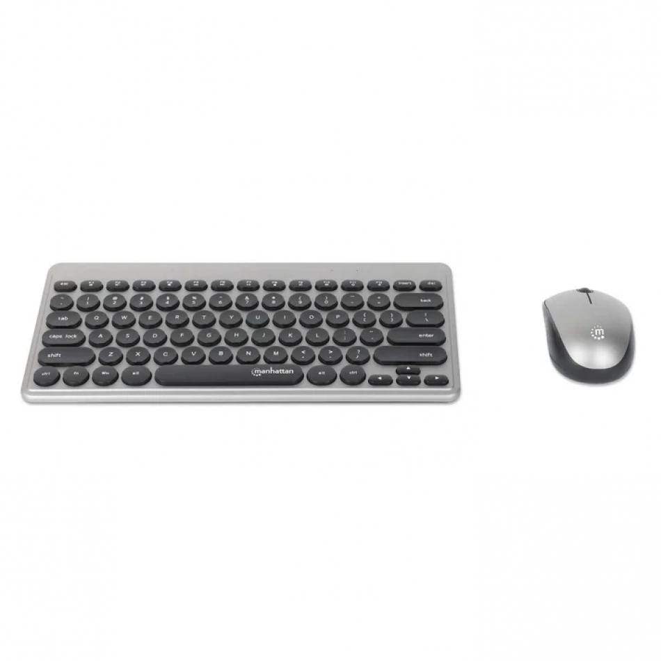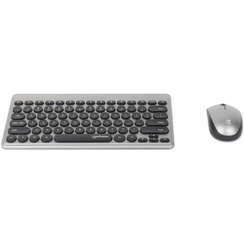 Kit inalámbrico Manhattan con miniteclado y mouse óptico de 1000 DPI, ideal para espacios reducidos gracias a su diseño compacto y delgado.
