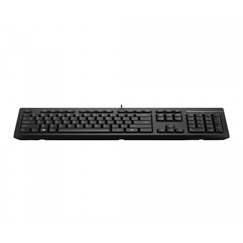Teclado HP 125 alámbrico USB , distribución inglés, color negro, compacto, silencioso y con teclado numérico completo.