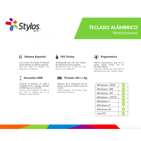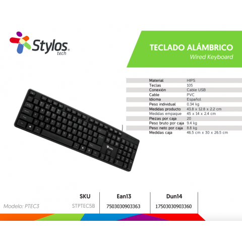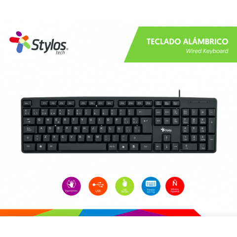 El Stylos STPTEC5B es un teclado alámbrico confiable y ergonómico, con teclas en español y una vida útil prolongada, ideal para usuarios que buscan practicidad y durabilidad en su equipo de cómputo.