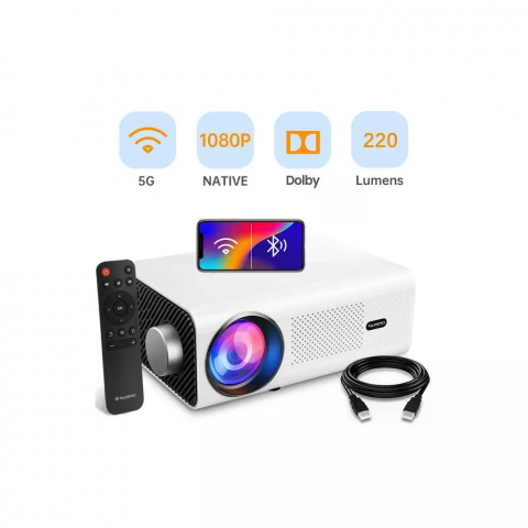 Proyector Vankyo Leisure 495W con tecnología LED, brillo de 220 ANSI lúmenes, resolución nativa Full HD (1920 × 1080), conectividad WiFi y Bluetooth. Compatible con HDMI, USB, AV y salida de audio 3.5 mm. Diseñado para entretenimiento en casa con proyección hasta 250 pulgadas. Color blanco.
